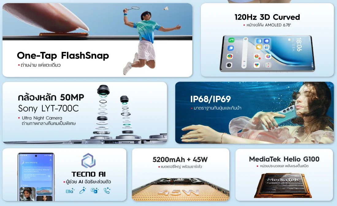 Sony LYT-700Cセンサー採用の光学手振補正付き50MPデュアルカメラや45W充電対応5200mAh大容量バッテリー、防水防塵(IP68/IP69)などが特徴です。OSはAndroid 15(HiOS)。接続端子はUSB Type-C、生体認証は指紋認証と顔認証に対応しています。