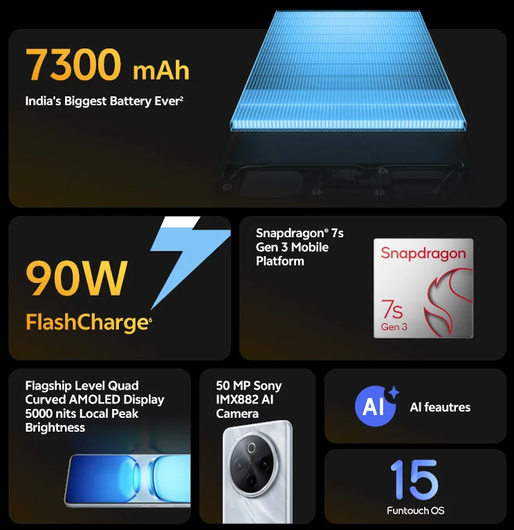 90W急速充電に対応した7300mAh大容量バッテリーやリフレッシュレート120Hzの有機ELディスプレイ、防水防塵耐衝撃に対応、OIS付50MPデュアルカメラなどが特長です。OSはAndroid 15(Funtouch OS 15)、指紋認証は画面内に配置、イヤホンジャックはなし、接続端子はUSB Type-Cです。