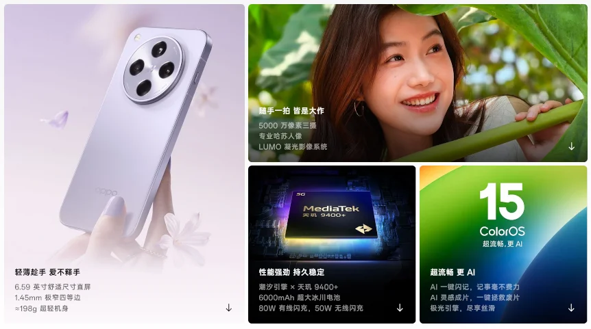 Hasselblad印の5000万画素トリプルカメラや新SoC MediaTek Dimensity 9400+採用、ハイスペックモデルの中では比較的コンパクトなディスプレイ、80W高速充電と50Wワイヤレス充電に対応した6000mAhバッテリーなどが特徴のモデルです。