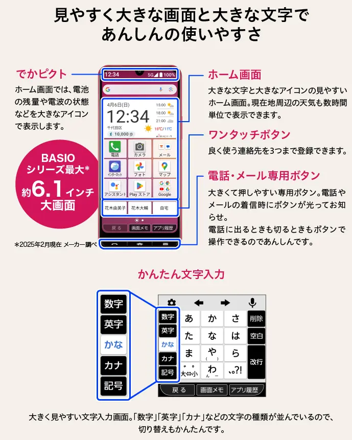 見やすく大きな画面と大きな文字に加え、電話・メール専用ボタン、かんたん文字入力、指紋認証センサー(サイド)搭載など初心者やシニア向け機能が盛り込まれた5Gスマホです。