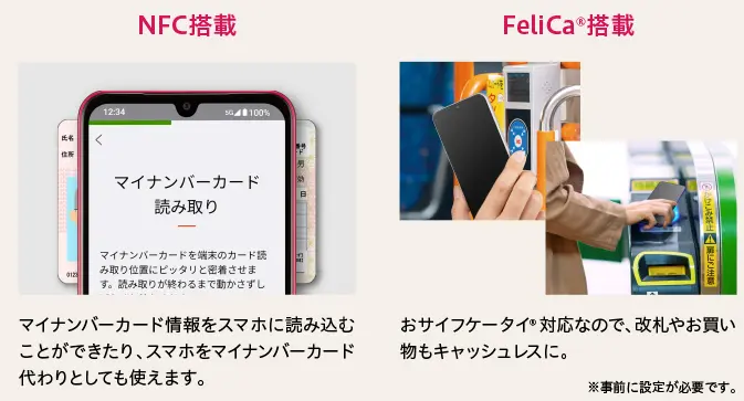 防水防塵・耐衝撃対応、おサイフケータイ(FeliCa)対応、接続端子はUSB Type-Cとなっています。