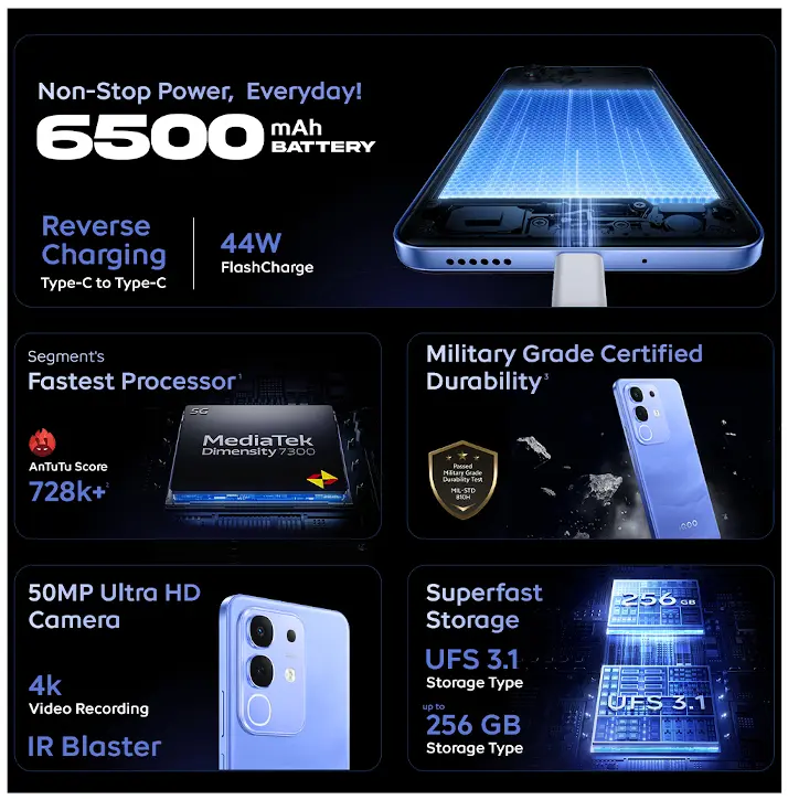 44W急速充電対応6500mAhバッテリー搭載やリフレッシュレート120Hzのディスプレイ、防水防塵・耐衝撃搭載などが特長です。OSはAndroid 15(Funtouch OS 15)、指紋認証はサイドに配置、接続端子はUSB Type-Cです。