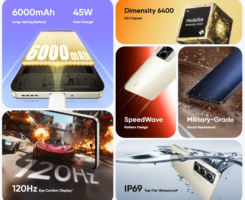 防水防塵・耐衝撃(IP69/IP68)対応やリフレッシュレート120Hzディスプレイ、45W充電対応の6000mAhバッテリーなどが特徴のモデルです。OSはAndroid 15 (realme UI 6.0)、生体認証は指紋認証センサー(サイド)と顔認証に対応、イヤホン端子はあり、接続端子はUSB Type-Cです。