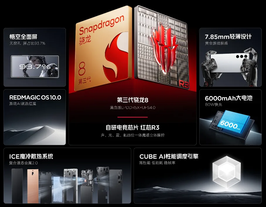 画面下にフロントカメラを内蔵しパンチホールやノッチをなくした完全ノッチレス仕様のディスプレイ、7.85ミリの薄型、Snapdragon 8 Gen 3採用、80W急速充電対応6000mAhバッテリー、光学手振れ補正付きカメラ、放熱システムICE 2.0、側面の感圧ボタンなどゲームに特化したハイスペックなゲーミングスマホです。OSはAndroid (REDMAGIC OS 10)、接続端子はUSB Type-Cです。