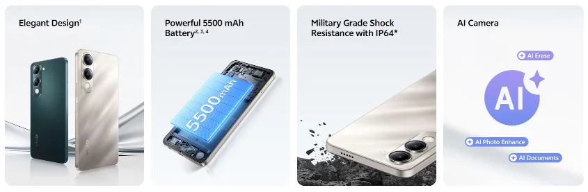 5500mAh大容量バッテリー搭載や防水防塵耐衝撃(IP64)などが特徴です。OSはAndroid 15 (Funtouch OS 15)、接続端子はUSB Type-C、イヤホン端子はあり、生体認証は指紋認証センサー(サイド)と顔認証に対応しています。