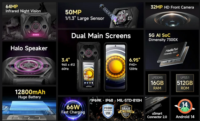 Ulefone Armor 30 Pro は、6.95インチFHD+(2460×1080)ディスプレイ、CPUはMediaTek Dimensity 7300X 2.5GHz オクタコア、RAM16GB、ストレージ容量は512GB、カメラは5000万画素+6400万画素+5000万画素トリプルカメラ搭載のハイスペックなアンドロイドスマートフォンです。