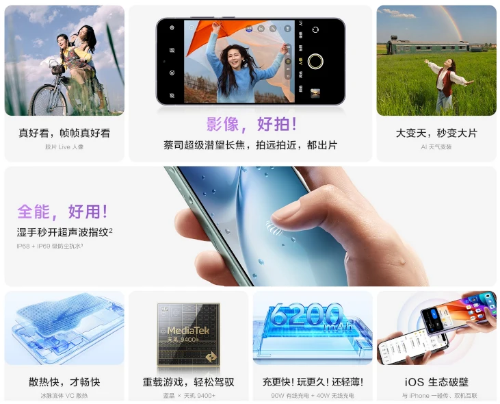 ハイスペックな新SoC MediaTek Dimensity 9400+やZEISS印のトリプルカメラ、リフレッシュレート120Hzの高解像度ディスプレイ、前モデルより容量アップした90W急速充電対応の6200mAhバッテリーなどが特長のモデルです。