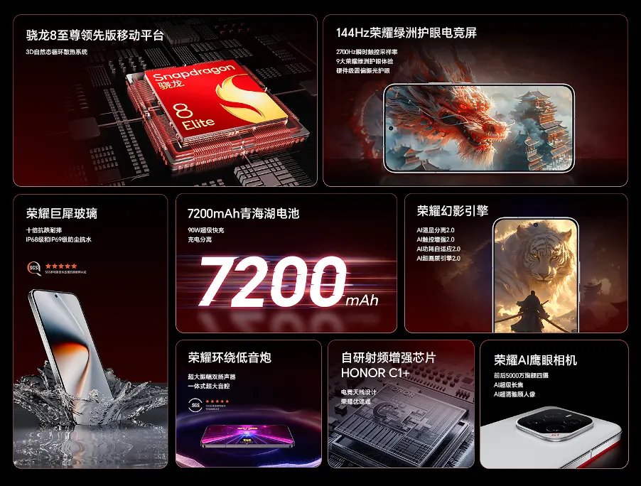 新SoC Snapdragon 8 Elite Leading Version採用や光学手振補正対応トリプルカメラ、90W充電対応7200mAh大容量バッテリー、リフレッシュレート144Hzで高解像度の有機ELディスプレイ、防水防塵(IP68/IP69)などが特徴のモデルです。OSはAndroid 15 (MagicOS 9.0)、指紋認証センサーは画面内に配置、イヤホン端子はなし、接続端子はUSB Type-Cです。