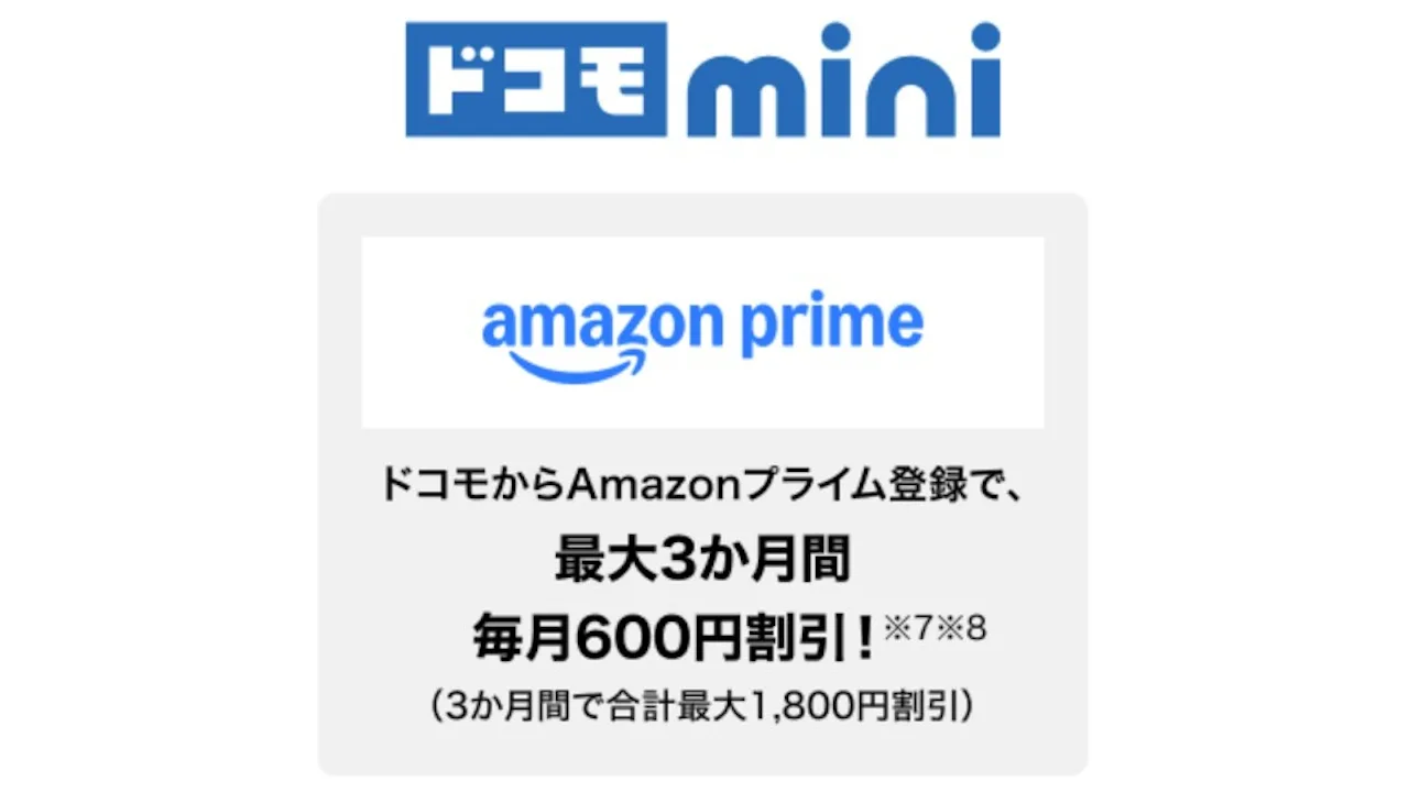 ドコモからの「Amazonプライム」登録から最大3か月間、月額会費にあたる600円/月を月額料金から割り引きます。3か月間の割引終了後、ご登録期間中はdポイント(期間・用途限定)を毎月120ポイント還元いたします。