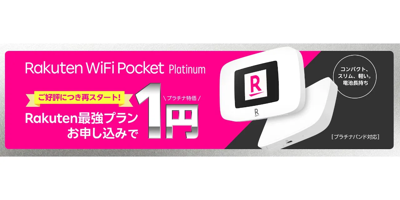 楽天モバイル(Rakuten最強プラン)は、モバイルWi-FiルーターのRakuten WiFi Pocket Platinumが1円で購入できる「Rakutenオリジナル製品 1円キャンペーン」を開始しました。