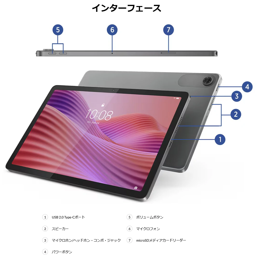 ドルビーアトモス対応のステレオスピーカーやWUXGA解像度ディスプレイなどが特徴のモデルです。OSはAndroid 14(2 回の OS アップグレードを予定)、バッテリー容量は5100mAh、イヤホン端子はあり、接続端子はUSB Type-Cです。