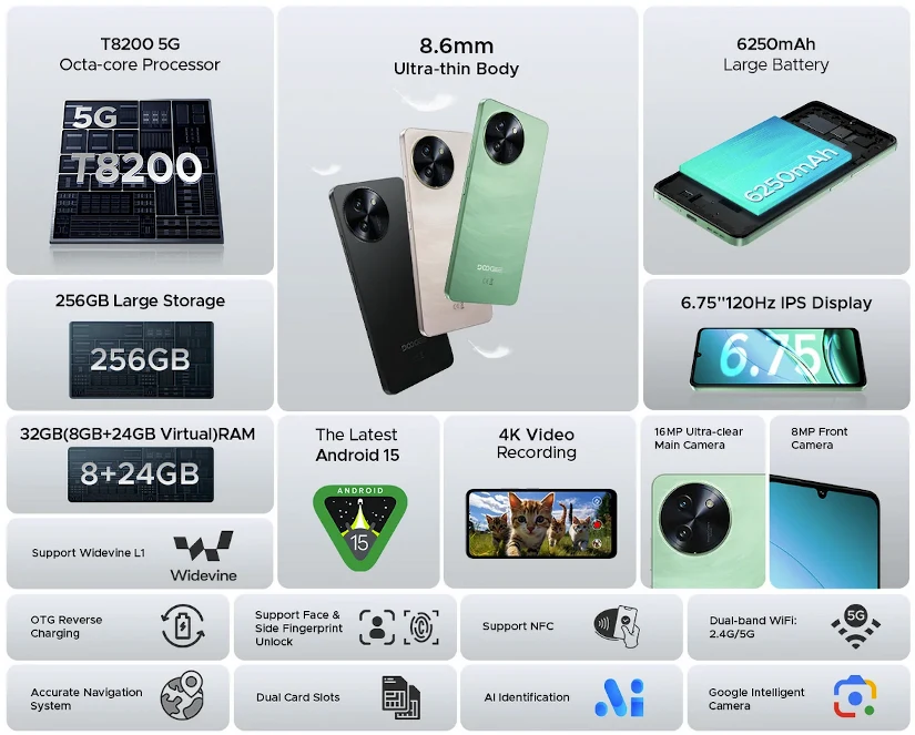 DOOGEE Note59 Pro は、6.75インチHD+(1600×720)ディスプレイ、CPUはUNISOC T765 (T8200) 2.3Ghz オクタコア、RAM8GB、ストレージは256GB、メインカメラは1600万画素カメラ搭載のミッドロークラスのアンドロイドスマートフォンです。