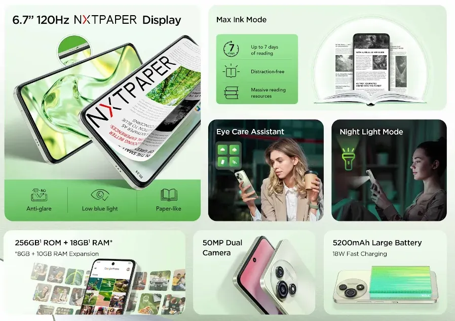 目に優しいNXTPAPERディスプレイや18W充電対応5200mAh、50MPデュアルカメラ搭載などが特徴です。OSはAndroid 15、防水(IP54)、生体認証は指紋認証センサー(サイド)と顔認証に対応、イヤホン端子はあり、接続端子はUSB Type-Cです。