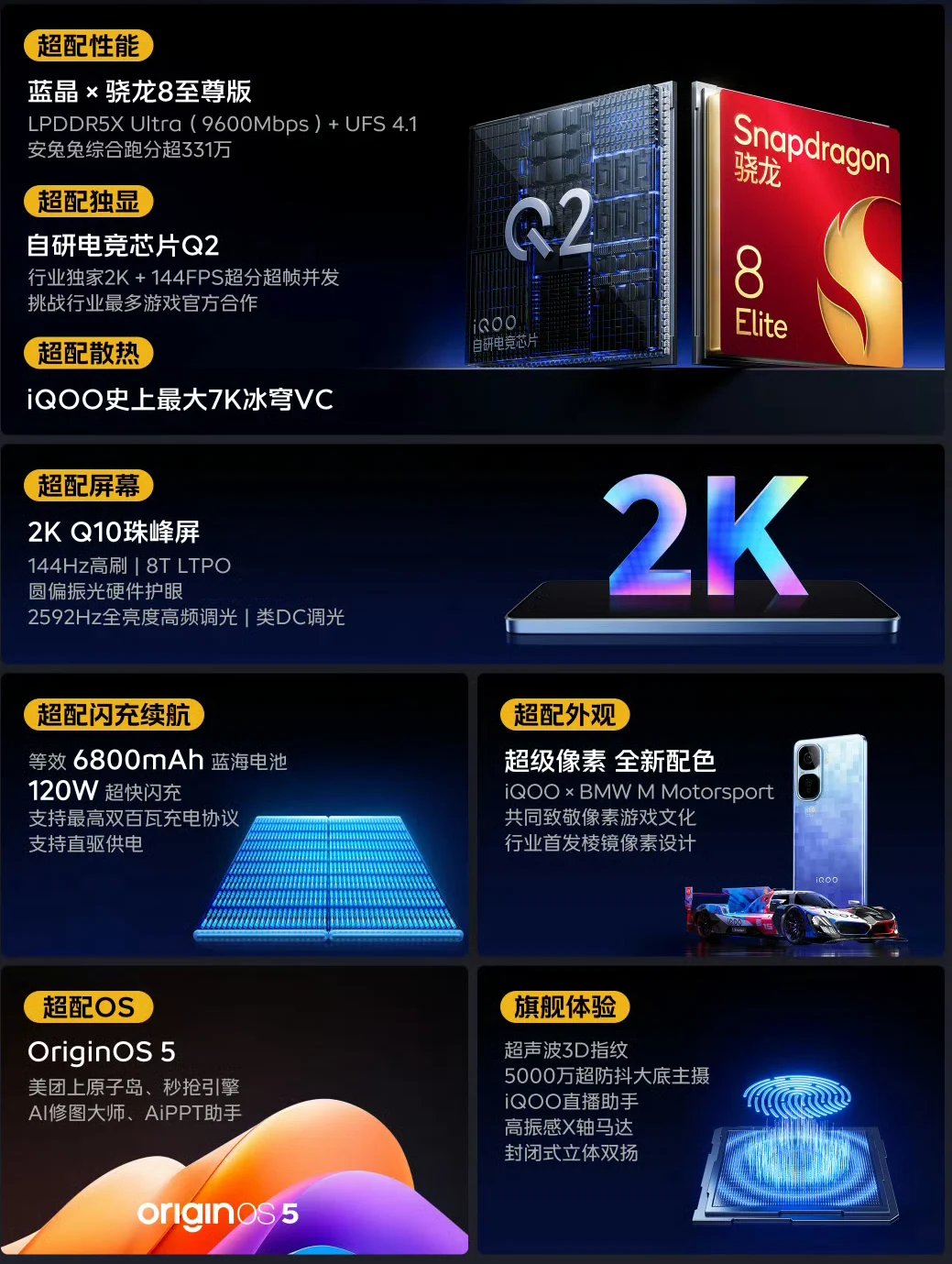 120W急速充電対応6800mAhバッテリーやリフレッシュレート144Hzで高解像度な8T LTPO AMOLEDディスプレイ、OIS付50MPカメラなどが特長です。OSはAndroid 15 (OriginOS 5)、画面内に指紋認証センサーを搭載、接続端子はUSB Type-C、イヤホン端子はなしです。