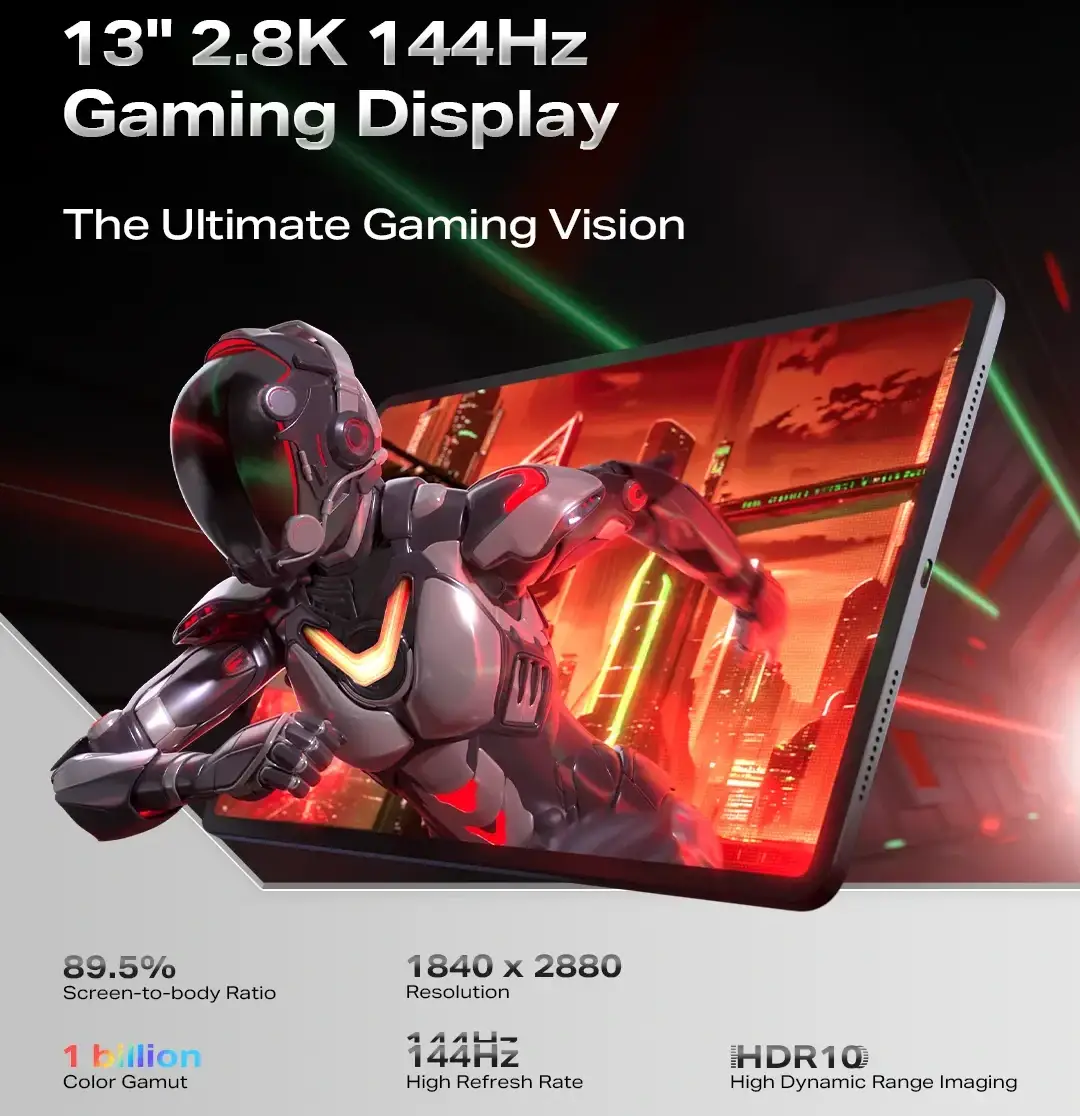 大型でリフレッシュレート144Hzの高解像度ディスプレイや8スピーカー、古い世代のSoC Snapdragon 888採用、10000mAh大容量バッテリーなどが特徴のAndroidゲーミングタブレットです。OSはAndroid 14、接続端子はUSB Type-Cです。