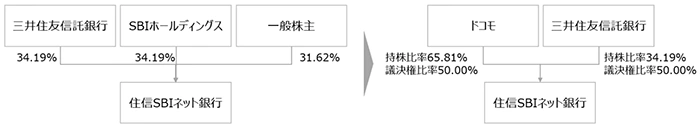 住信SBIネット銀行の株式については持株比率ではドコモが65.81%、三井住友信託銀行が34.19%を保有することとなり、議決権比率ではドコモと三井住友信託銀行が50%ずつを保有します。