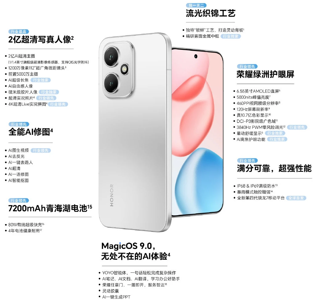 Snapdragon 7 Gen 4搭載や光学手振補正対応カメラ、大容量7200mAhバッテリー、防水防塵(IP68/IP69)、2億画素カメラ、リフレッシュレート120Hzで高解像度の有機ELディスプレイなどが特徴のモデルです。先日発表したグローバル版 HONOR 400とはSoC(7 Gen 3→7 Gen 4)とバッテリー容量(6000mAh→7200mAh)、防水性能が異なっています。