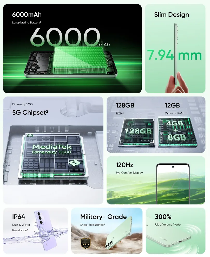 6000mAh大容量バッテリーや防水防塵耐衝撃(IP64)、5G通信対応などが特徴です。OSはAndroid 15 (realme UI 6.0)、イヤホン端子はなし、接続端子はUSB Type-Cです。