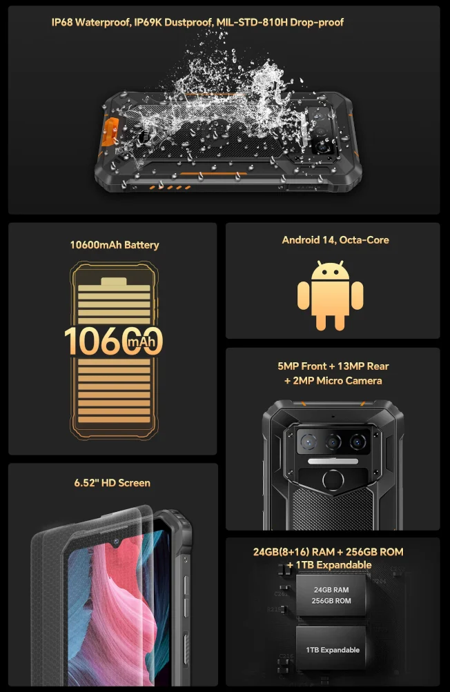 OUKITELがタフネススマートフォン「OUKITEL WP23 Plus」を発表。10600mAhの超大容量バッテリー、UNISOC T606、8GB RAM・256GBストレージ、IP68/IP69K防水防塵・MIL規格準拠の耐衝撃性能が特長。6.52インチディスプレイ、Android 14搭載、背面指紋認証と顔認証対応。