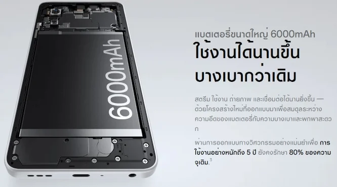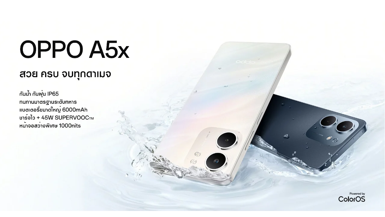 OPPO A5x (4G版)は、Snapdragon 6s 4G Gen 1と6000mAhバッテリーを搭載した6.67インチの防水防塵対応スマートフォン。90Hz表示、3200万画素カメラ、指紋+顔認証に対応し、イヤホン端子も装備。Android 15ベースのColorOS搭載。タイで3999バーツ(約1.8万円)から販売。