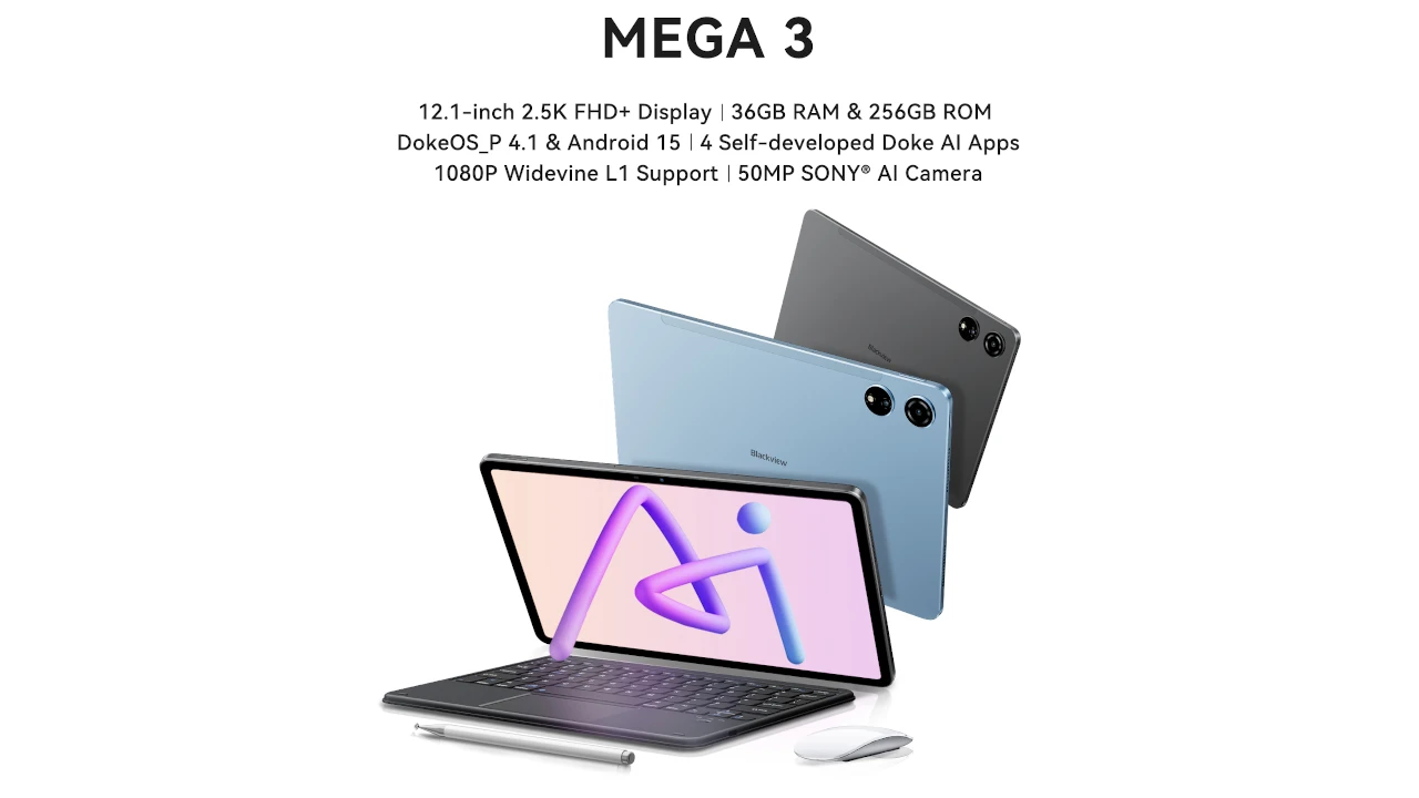 Blackview MEGA 3は、Helio G100と12.1インチWQXGAディスプレイを搭載したAndroid 15タブレット。12GB RAMと256GBストレージ、クアッドスピーカー、スタイラス対応、8800mAhバッテリーを備えたミッドレンジモデル。33W急速充電やPCモード対応などが特徴で、価格は約236ドル。