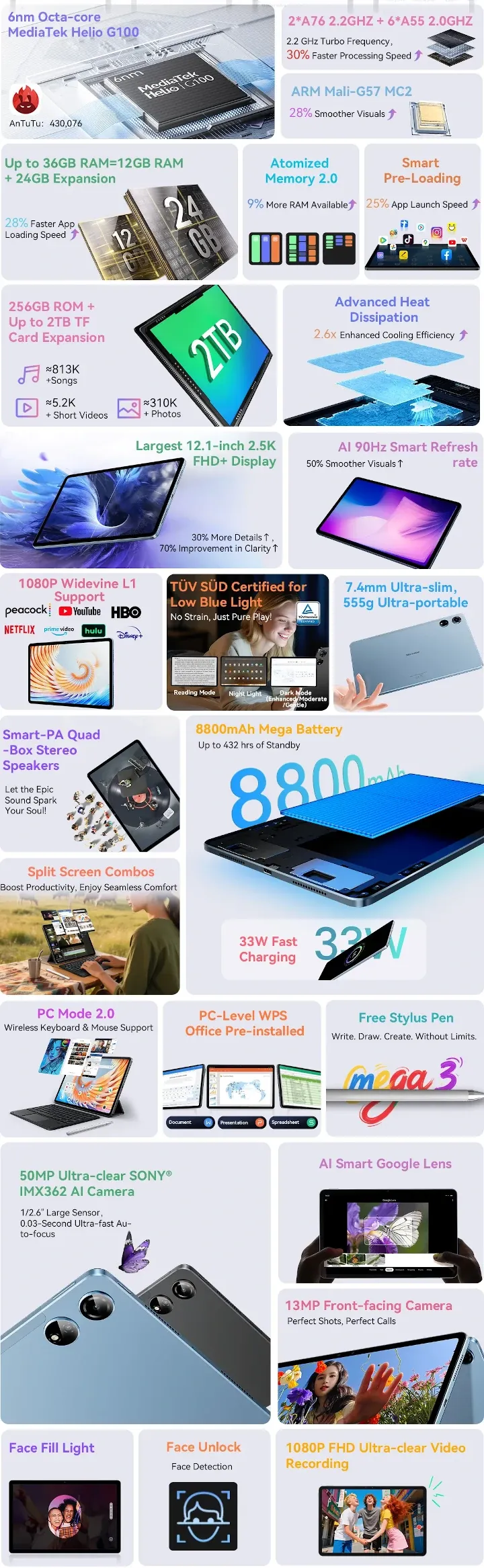 Blackview MEGA 3 は、12.1インチWQXGA(2560×1600) ディスプレイを搭載し、CPUはMediaTek Helio G100 2.2GHz オクタコア、RAM12GB、ストレージ容量は256GB、メインカメラ5000万画素+200万画素デュアルカメラ搭載のミッドレンジクラスのアンドロイドタブレットです。