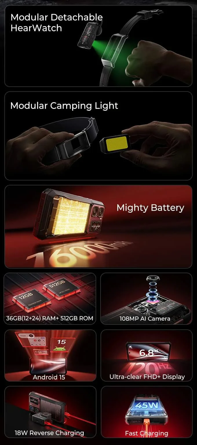 背面にスマートウォッチにもなる取り外し可能なモジュール式ヘッドセットやモジュール式キャンプ用LEDライトを装着できるのが特長のタフネスモデルです。108MPカメラ、45W充電対応16000mAhバッテリー、防水防塵耐衝撃(IP68/IP69K,MIL-STD-810H)対応、OSはAndroid 15、イヤホン端子はなし、接続端子はUSB Type-Cです。