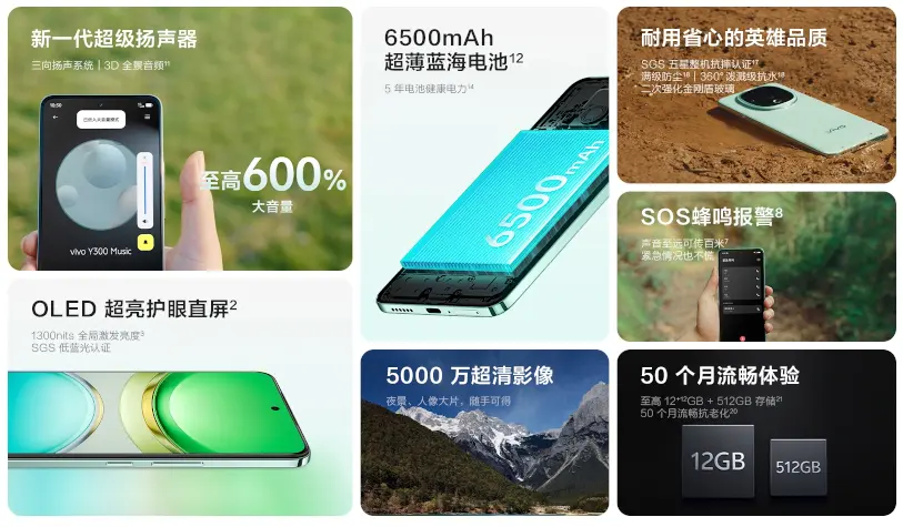 背面の大音量スピーカーや6500mAh大容量バッテリー、リフレッシュレート120Hzの有機ELディスプレイ、防水防塵耐衝撃に対応、50MPデュアルカメラなどが特長です。OSはAndroid 15(OriginOS 5)、指紋認証は画面内に配置、イヤホンジャックはなし、接続端子はUSB Type-Cです。