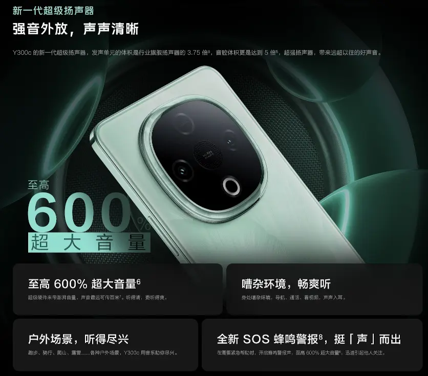 vivo Y300cは、MediaTek Dimensity 6300や120Hz AMOLEDディスプレイ、6500mAhバッテリーを搭載した5G対応のミッドレンジスマートフォン。大音量ステレオスピーカー、防水防塵、画面内指紋認証に対応し、Android 15(OriginOS 5)を採用。価格は1399CNY(約2.9万円)から。
