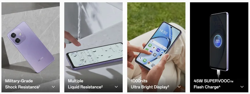 45W充電対応バッテリーやリフレッシュレート90Hzのディスプレイなどが特徴です。OSはAndroid 15 (ColorOS 15.0)、防水防塵耐衝撃対応、生体認証は指紋認証センサーと顔認証に対応、イヤホン端子はあり、接続端子はUSB Type-Cです。