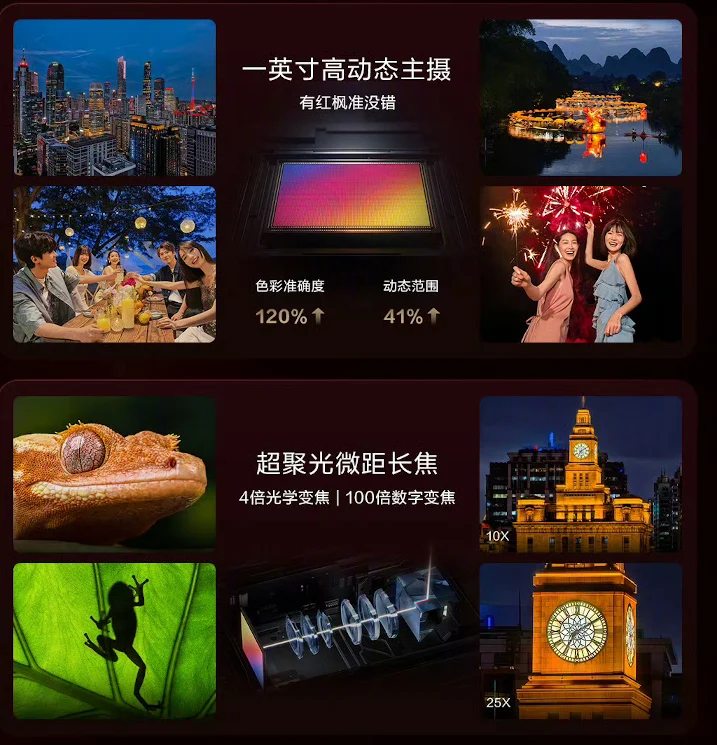 メインカメラ : 5000万画素(メイン 1インチ RYYB F1.4~4.0 OIS)+4000万画素(超広角 RYYB F2.2)+4800万画素(望遠 光学4x F2.1 OIS)+150万画素(スペクトルカメラ)クアッドカメラ
