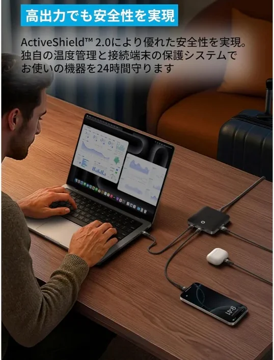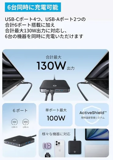 ・6台同時に充電可能:4つのUSB-Cポートと2つのUSB-Aポートを搭載し、合計6台の機器を同時に充電可能。合計最大130W、単ポート最大100Wの出力でMacBook Proの充電にも対応する他、MacBook Air、iPhone 16、AirPods等を3台同時に充電できます。