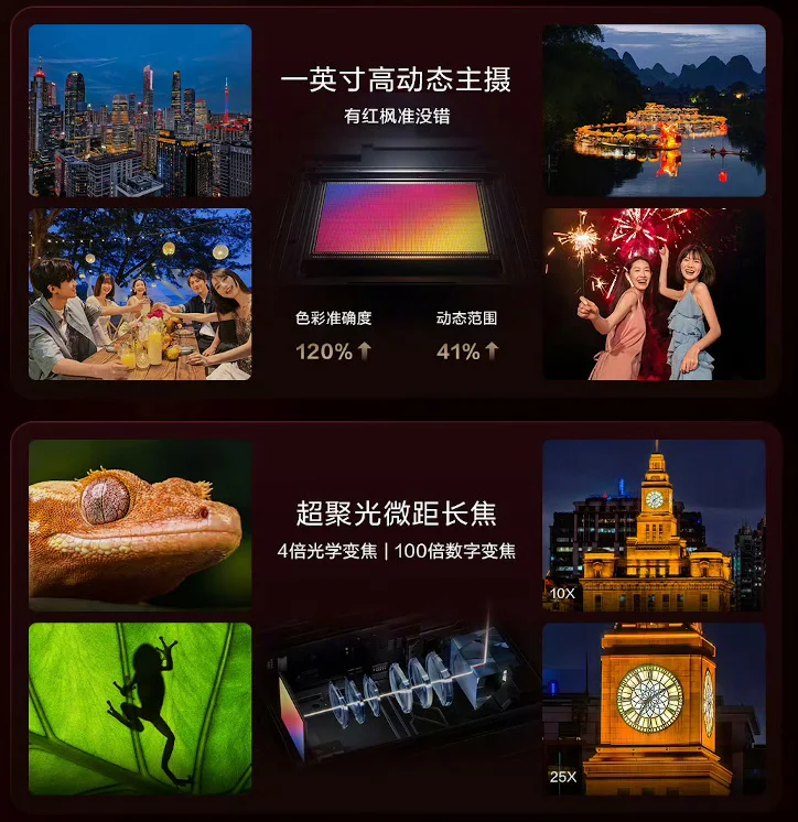 メインカメラ : 5000万画素(メイン 1インチ RYYB F1.6~4.0 OIS)+4000万画素(超広角 RYYB F2.2)+4800万画素(望遠 光学4x F2.1 OIS)+150万画素(スペクトルカメラ)クアッドカメラ