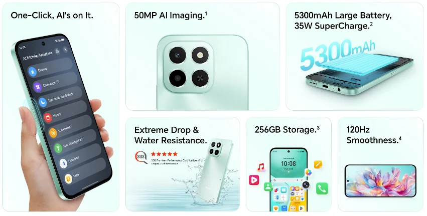 HONOR X6c は、Helio G81 Ultraを搭載したエントリースマートフォン。6.61インチHD+ディスプレイや50MPカメラ、5300mAhバッテリー(35W充電)を備え、防水防塵(IP64)やAndroid 15にも対応。マレーシアでの価格は599MYR(約2.1万円)、アジア市場にて2025年6月発売。