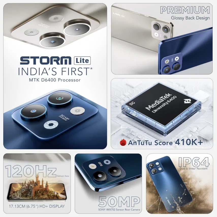 Lava Storm Lite 5G は、Dimensity 6400搭載・120Hz対応の6.75インチ5Gスマートフォン。RAM4GB、ストレージ64GB/128GB、5000万画素IMX752カメラや防水防塵(IP64)に対応し、価格は7999INR(約1.4万円)と低価格。OSはAndroid 15、5000mAhバッテリーを搭載し、日常用途に最適な構成です。