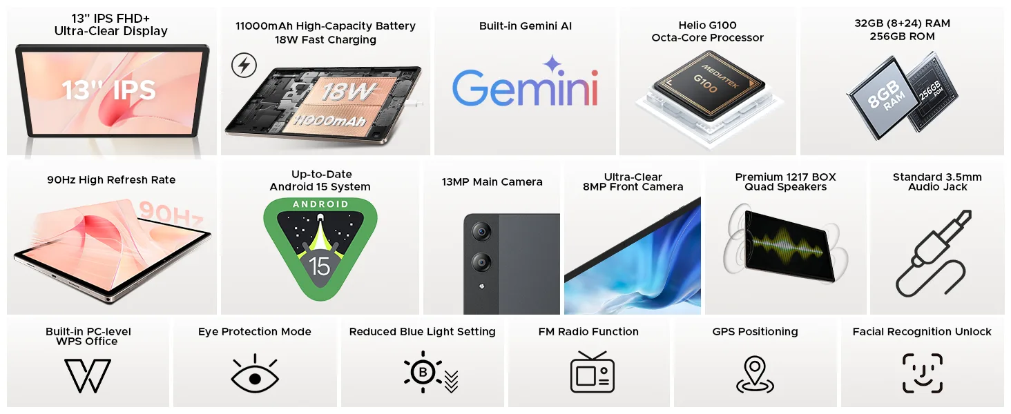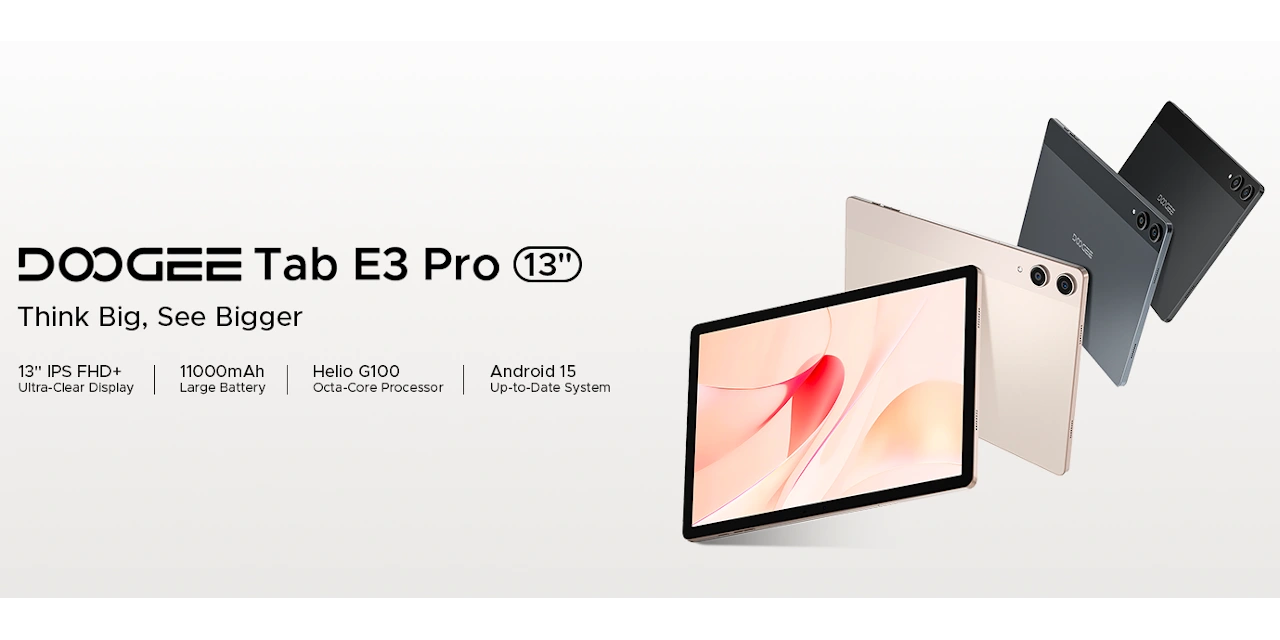 DOOGEE Tab E3 Pro は、13インチWUXGAディスプレイやHelio G100搭載のミッドレンジAndroidタブレット。11000mAh大容量バッテリーやクアッドスピーカー、4G LTE対応を備え、RAM8GB・ストレージ256GBで約300ドル。Android 15を搭載し、普段使いから動画視聴まで幅広く対応する大画面モデルです。