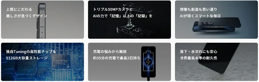 リフレッシュレート144Hzで高解像度なLTPO 有機ELディスプレイやMediaTek Dimensity 8350 Extreme採用、ソニー LYTIA LYT-700Cセンサーの光学手振補正付きカメラ、90W充電対応5000mAhバッテリー(90W充電器同梱)などが特長のモデルです。