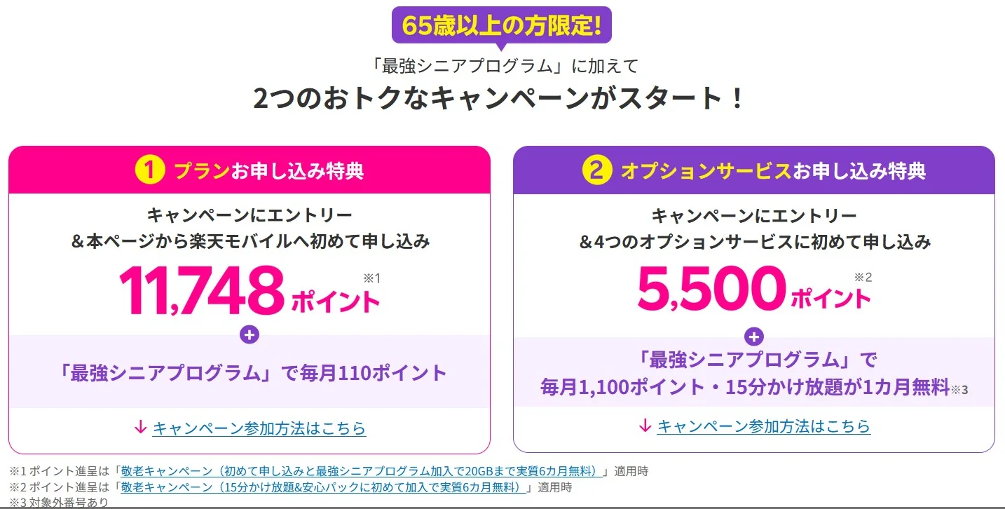 ・対象者:65歳以上で、「Rakuten最強プラン」に初めて申し込み、「最強シニアプログラム」にエントリーするユーザー