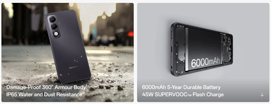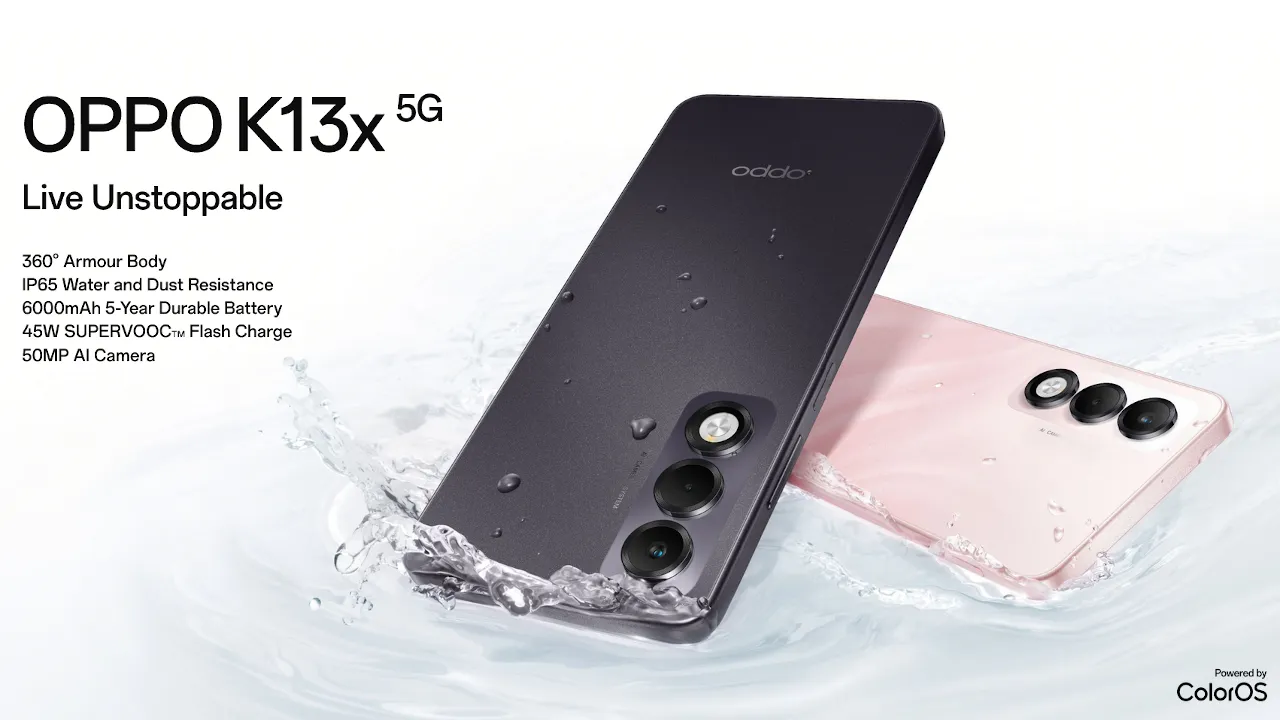 OPPO K13x 5Gは、6000mAh大容量バッテリーや45W急速充電、MediaTek Dimensity 6300を搭載した5G対応ミッドレンジスマートフォン。6.67インチ120Hz液晶ディスプレイやIP65防水防塵、5000万画素デュアルカメラなど実用性の高い仕様。OSはAndroid 15、イヤホン端子あり。インドで2025年6月発売、価格は11,999INR(約2.1万円)から。