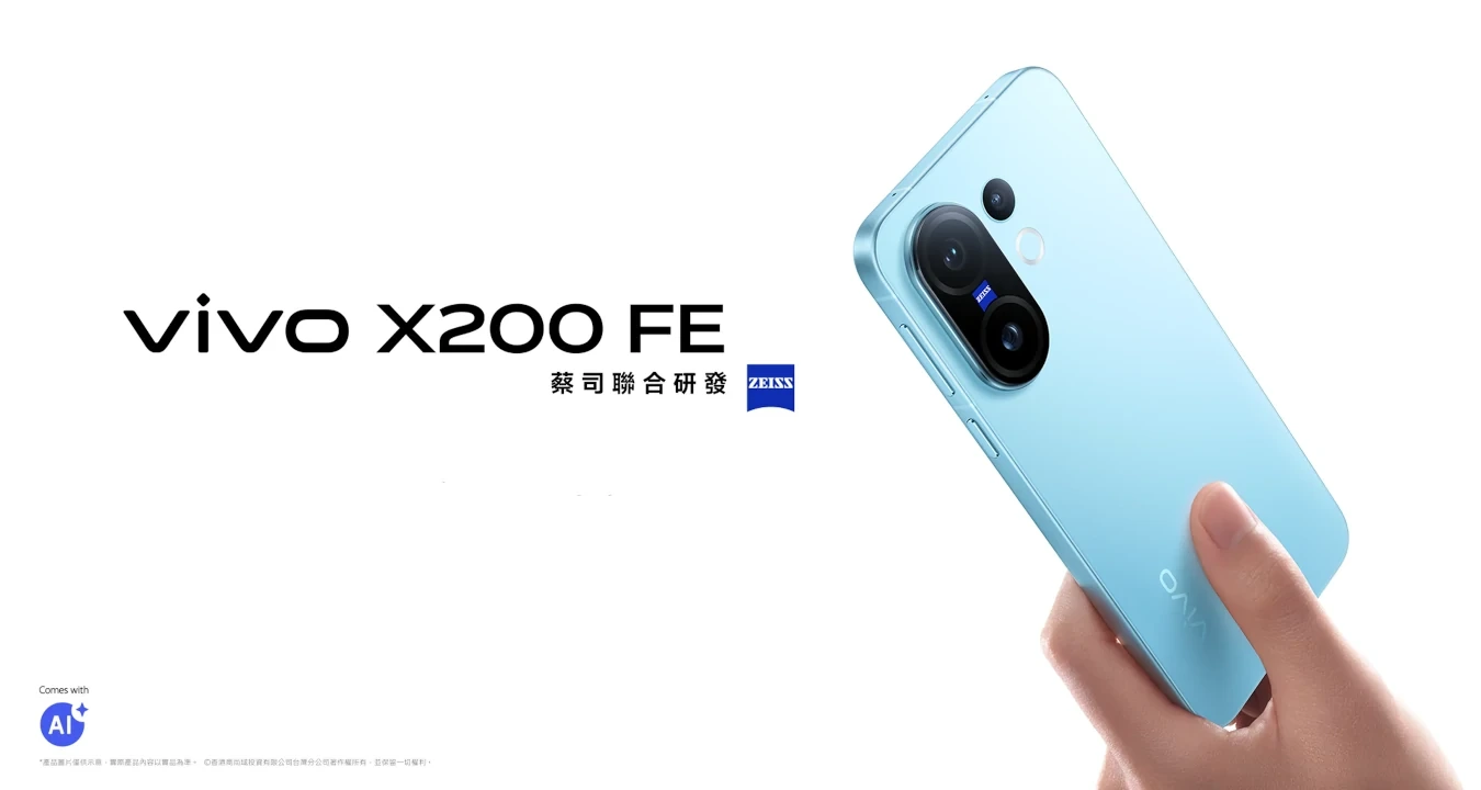 vivo X200 FEは、6.31インチ120Hz AMOLEDディスプレイ、Dimensity 9300+、12GB RAM+512GBストレージ、90W充電対応の6500mAhバッテリーを搭載したコンパクトなハイエンド5Gスマートフォン。光学手ぶれ補正付き5000万画素トリプルカメラやIP68/IP69防水、画面内指紋認証、Android 15採用。台湾で26,990TWD(約13.4万円)。