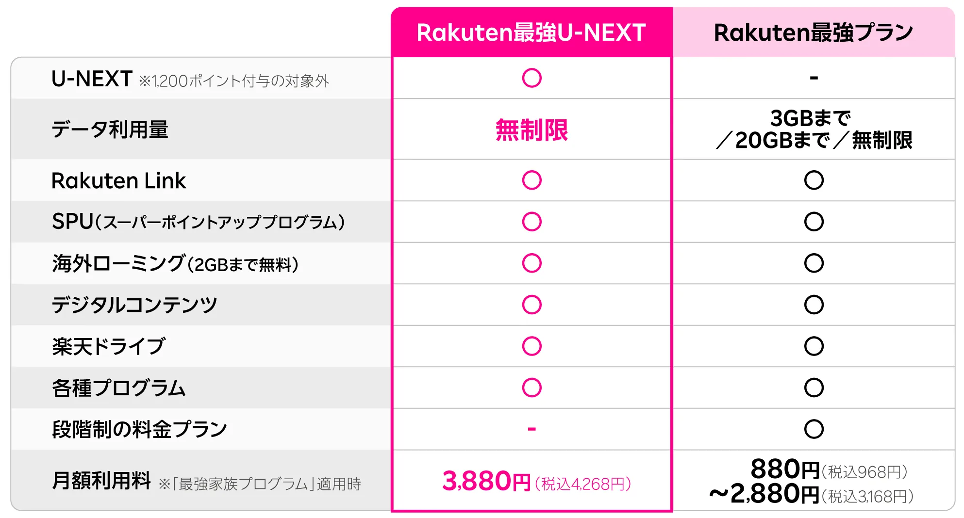 ・楽天モバイル「Rakuten最強プラン(3,278円)」+「U-NEXT見放題(2,189円)」の新パック、1,078円/月お得に