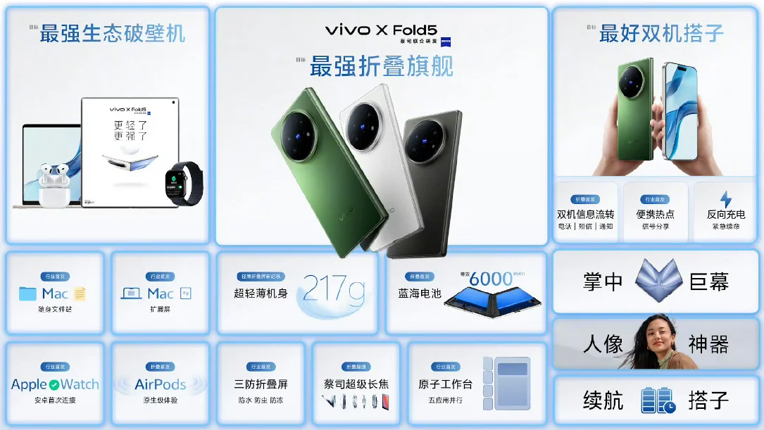 vivoが新型フォルダブルスマホ「X Fold5」を中国で発表。8.03型AMOLED内画面と6.53型外画面、Snapdragon 8 Gen 3、ZEISS監修トリプルカメラ、防水防塵、6000mAhバッテリーなどを搭載した軽量・高性能な折りたたみスマートフォン。価格は6999元(約14.2万円)から。