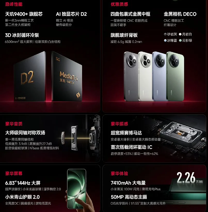 AnTuTuベンチ 324万のMediaTek Dimensity 9400+採用、光学手振補正付デュアルカメラ、100W急速充電に対応した7410mAh大容量バッテリー、リフレッシュレート144Hzの高解像度AMOLEDディスプレイ、グラフィックチップ「D2」などが特徴のモデルです。