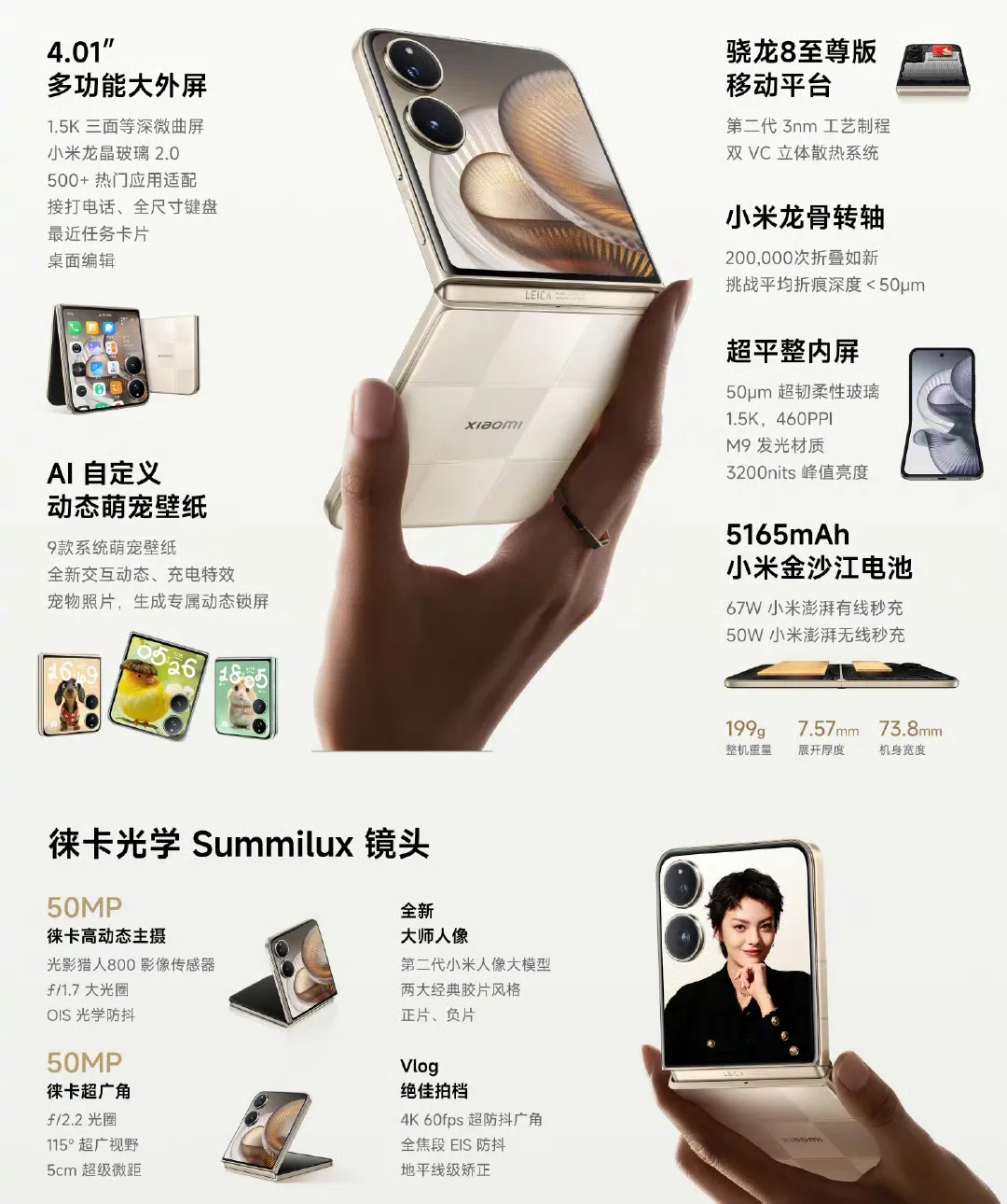 Xiaomiが縦折りフォルダブルスマートフォン「Xiaomi MIX Flip 2」を発表。Snapdragon 8 Elite搭載、Leicaレンズ採用のOIS付きデュアルカメラ、6.86インチ&4.01インチの120Hz AMOLEDディスプレイ、5165mAhバッテリーは67W急速充電&50Wワイヤレス充電対応。価格は5999元(約12.1万円)から。