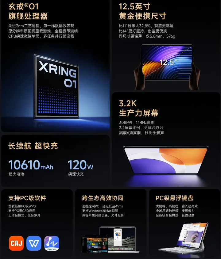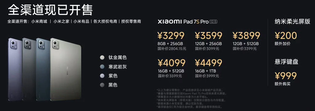 Xiaomiが12.5インチ高性能タブレット「Xiaomi Pad 7S Pro 12.5」を発表。自社製チップ「XRING O1」搭載、144Hzの高解像度ディスプレイ、10610mAhバッテリーと120W急速充電に対応。6スピーカー搭載で迫力ある音響も実現。Android 15ベースのHyperOS 2搭載、価格は3299元(約6.8万円)から。カラーは4色展開。