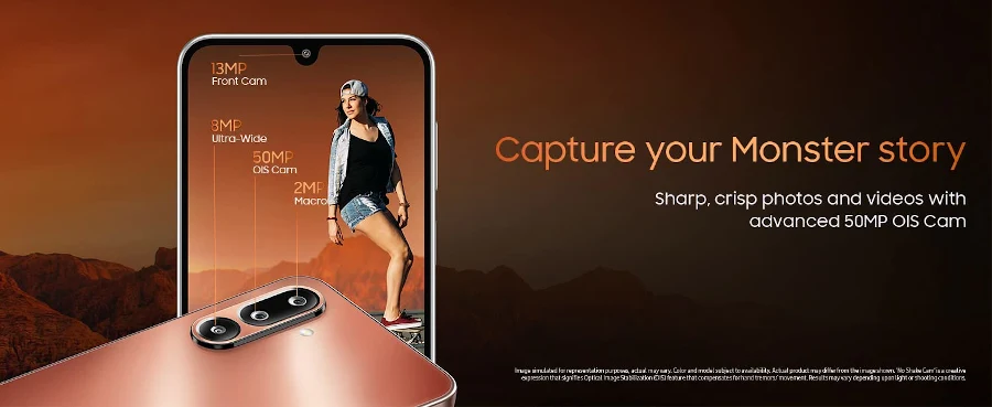 カラーはOrenge Haze , Velvet Black , Serene Greenの3色展開。インドで2025年7月に発売、価格はRAM6GB/128GBが17,499INR(約3.0万円)、RAM8GB/256GBが17,999INR(約3.1万円)、RAM8GB/256GBが20,999INR(約3.5万円)です。