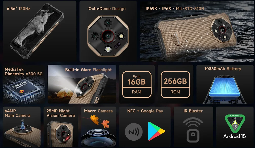 Ulefone Armor X16 Proは、堅牢設計の5G対応スマートフォン。10360mAhの大容量バッテリーや暗所撮影対応のナイトビジョンカメラを搭載し、IP68/IP69K・MIL-STD-810Hに準拠した耐久性を確保。Dimensity 6300や8GB RAM、120Hzディスプレイなど性能も十分で、アウトドアや現場作業に適したタフネスモデル。
