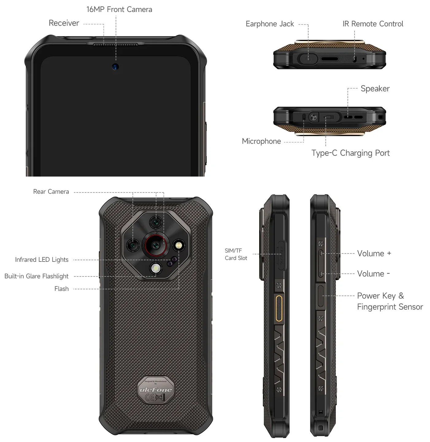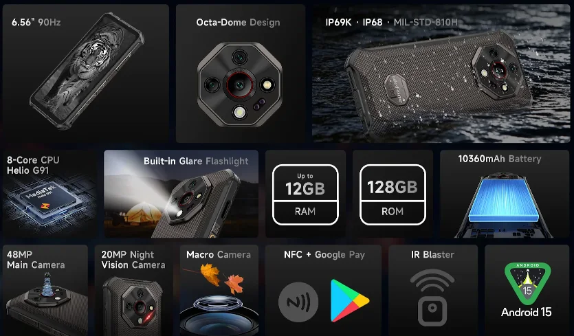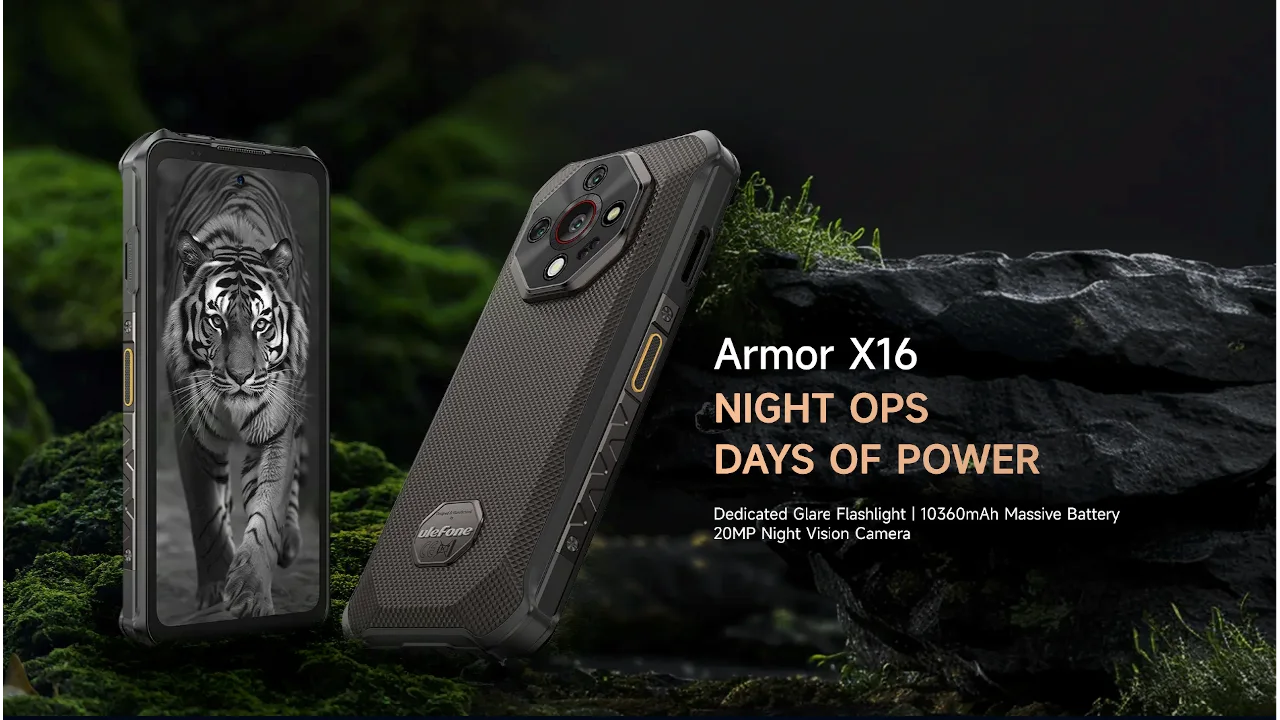 Ulefone Armor X16は、Helio G91を搭載したタフネス仕様の4Gスマートフォン。6.56インチHD+ディスプレイやNight Vision対応トリプルカメラ、大容量10,360mAhバッテリー、防水防塵・耐衝撃性能(IP68/IP69K、MIL-STD-810H)などが特長。Android 15搭載。アウトドア用途にも適した堅牢モデルです。