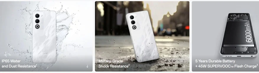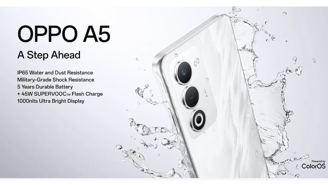 急速充電対応45W対応の6000mAhバッテリーやリフレッシュレート120Hzのディスプレイ、50MPデュアルカメラ、防水防塵耐衝撃対応などが特徴です。中国で販売中のOPPO A5とはスペックの異なる別モデルです。