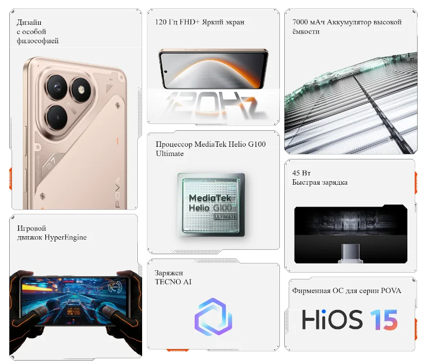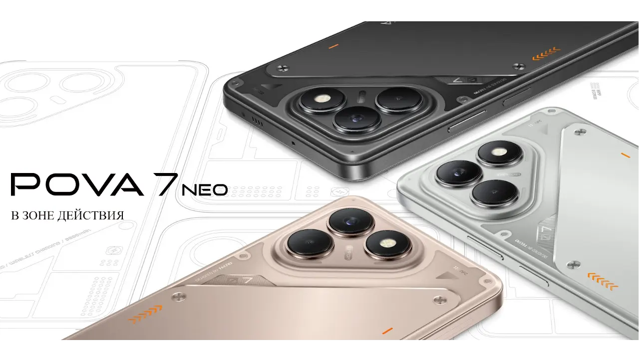 TECNO POVA 7 Neoは、MediaTek Helio G100 Ultimateを搭載した6.78インチFHD+のミッドレンジ4Gスマートフォン。120Hzディスプレイ、1億画素デュアルカメラ、7000mAhバッテリー(45W急速充電)、IP64防水、Android 15搭載が特長。ロシアなどで発売。
